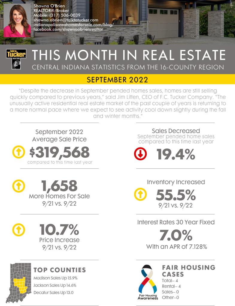 Following the trend of the past few months, September home sales in central Indiana once again decreased, while average sale prices and available inventory continued to increase. Monthly real estate statistics from F.C. Tucker Company found that central Indiana year-to-date home sale prices increased 13.2 percent, and available inventory also continued to increase, up 55.5 percent, compared to September 2021. Pended home sales decreased by 19.4 percent.